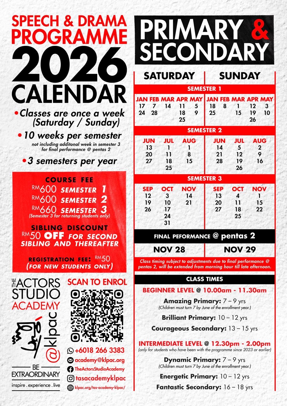 By conceptualising a curriculum approach that honours continuous growth and development, students engage with teachers and friends for as long as they continue to stay with us. This removes the barrier of a rigid level of teaching and learning. Additionally, our returning students will develop a sense of leadership by mentoring and assisting new students in activities and conducting our showcase. They will be given the opportunity to take on an artistic role such as directing and script writing, allowing returning students to experiment with their knowledge while instilling a sense of mastery based on what they have learned.